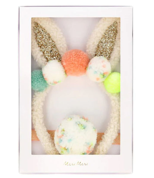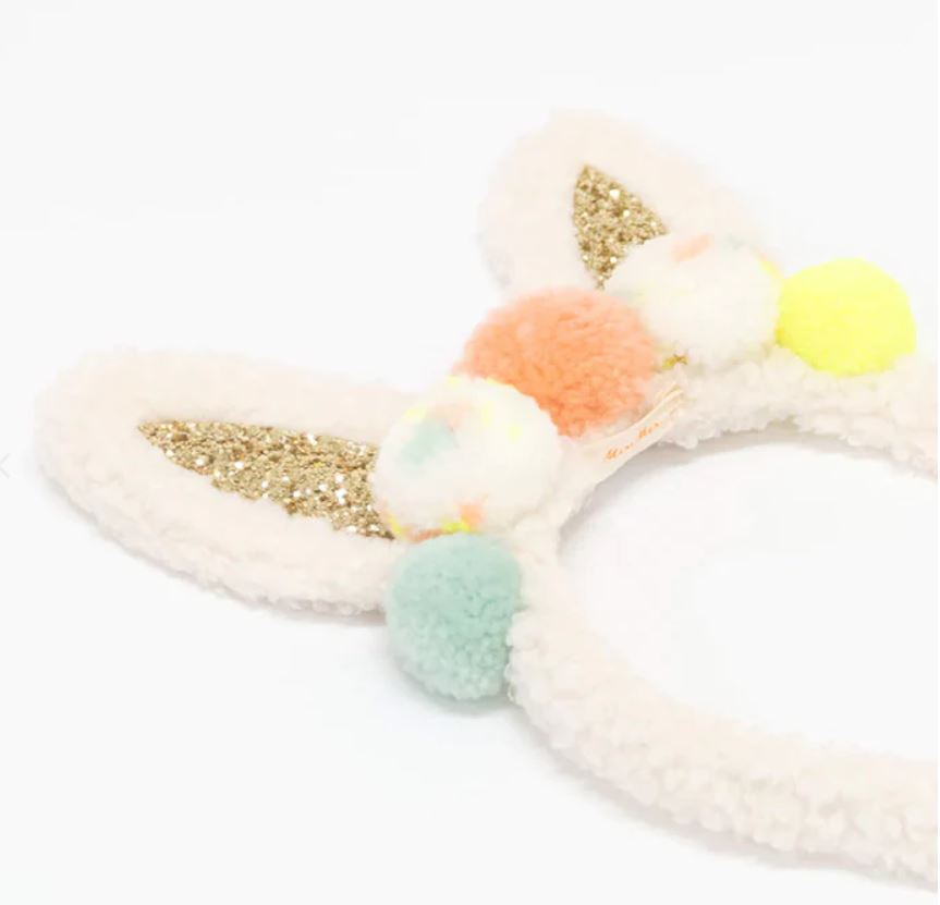 Disfraz de conejito que incluye orejas hechas a mano con peluchito blanco, pompones y tela de purpurina dorada y cola en forma de pompón, ¡Precioso!