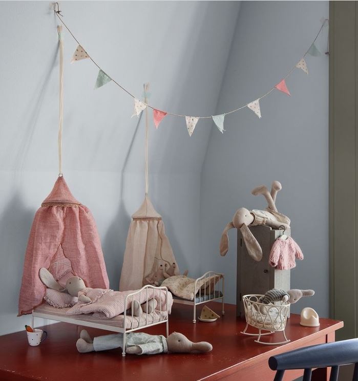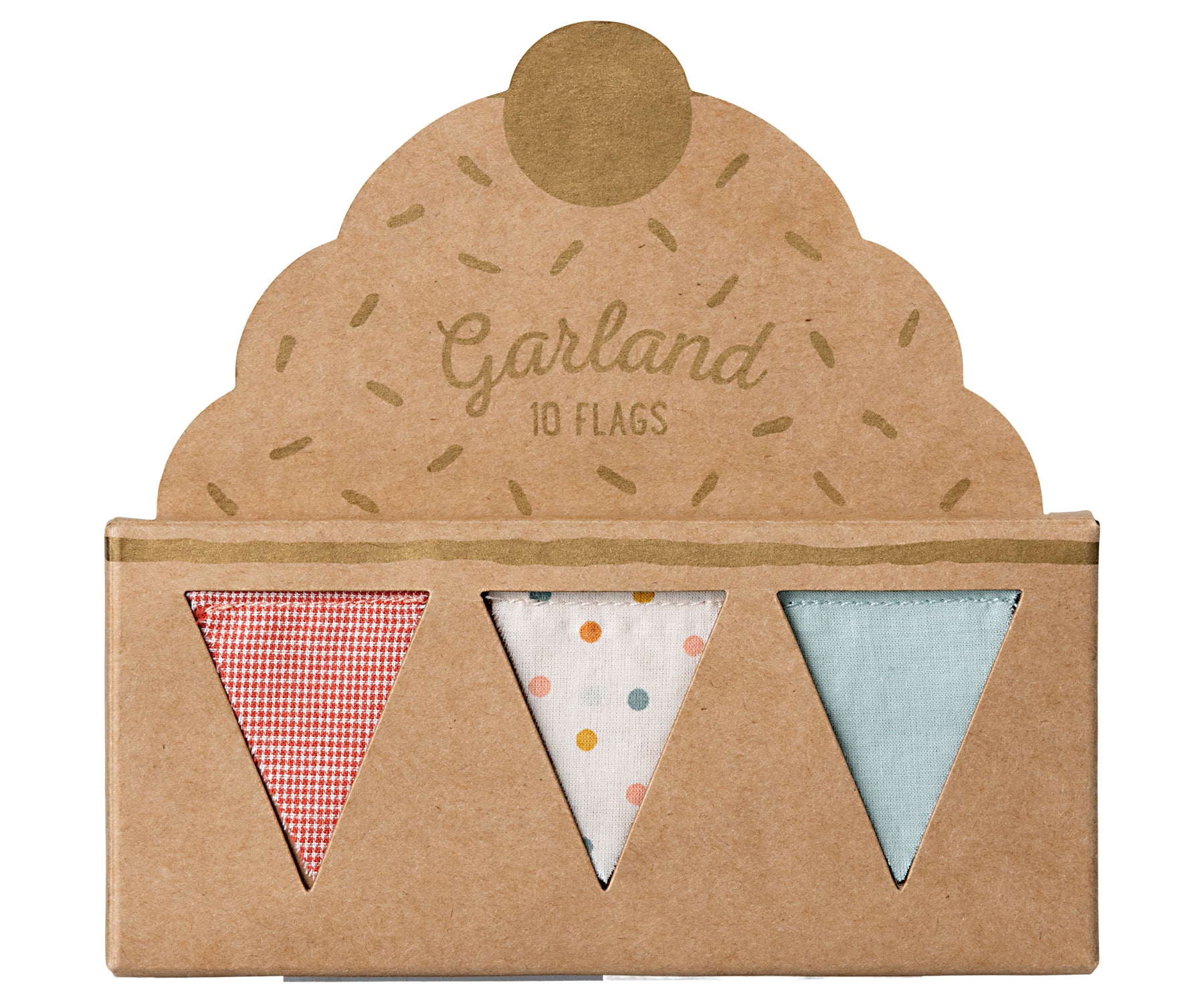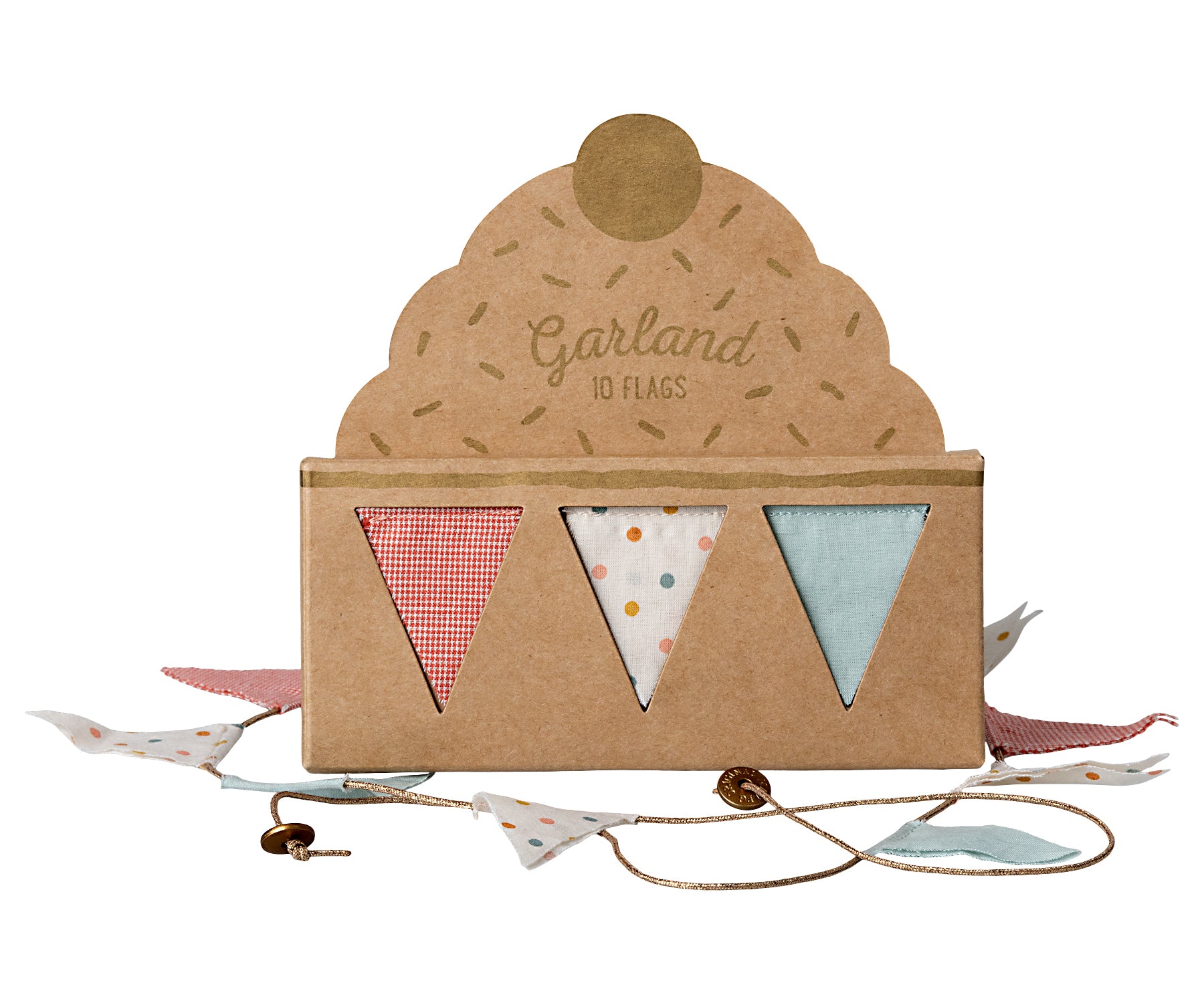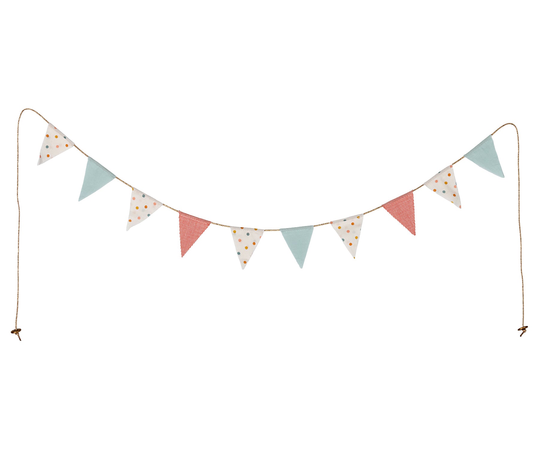 El toque decorativo definitivo para tu casa de muñecas o tu rincón Maileg, una versión con banderines pequeños (5cm alto) en telas con colores clásicos de Maileg.