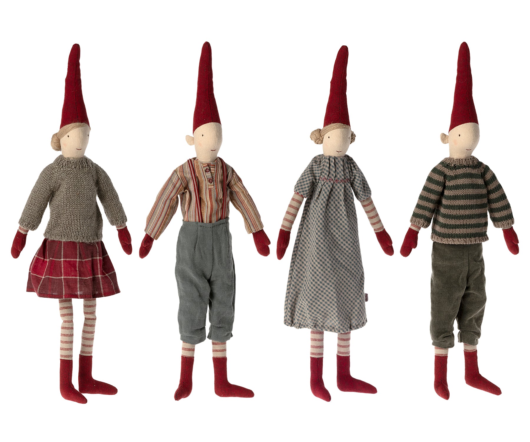 Duendecillos de Navidad. Una colección de 4 estilos diferentes, todos vestidos con una preciosa ropa navideña hecha de materiales exclusivos. Son adorables para cualquier decoración navideña y se pueden mezclar y combinar distintos tamaños y colecciones. Precio por unidad