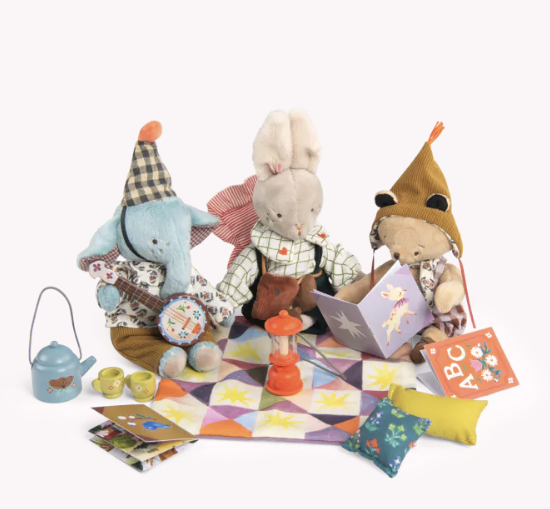 Contenido: Banjo, linterna, dos tazas de madera, tres cojines, tres libros de cuentos, tetera.
