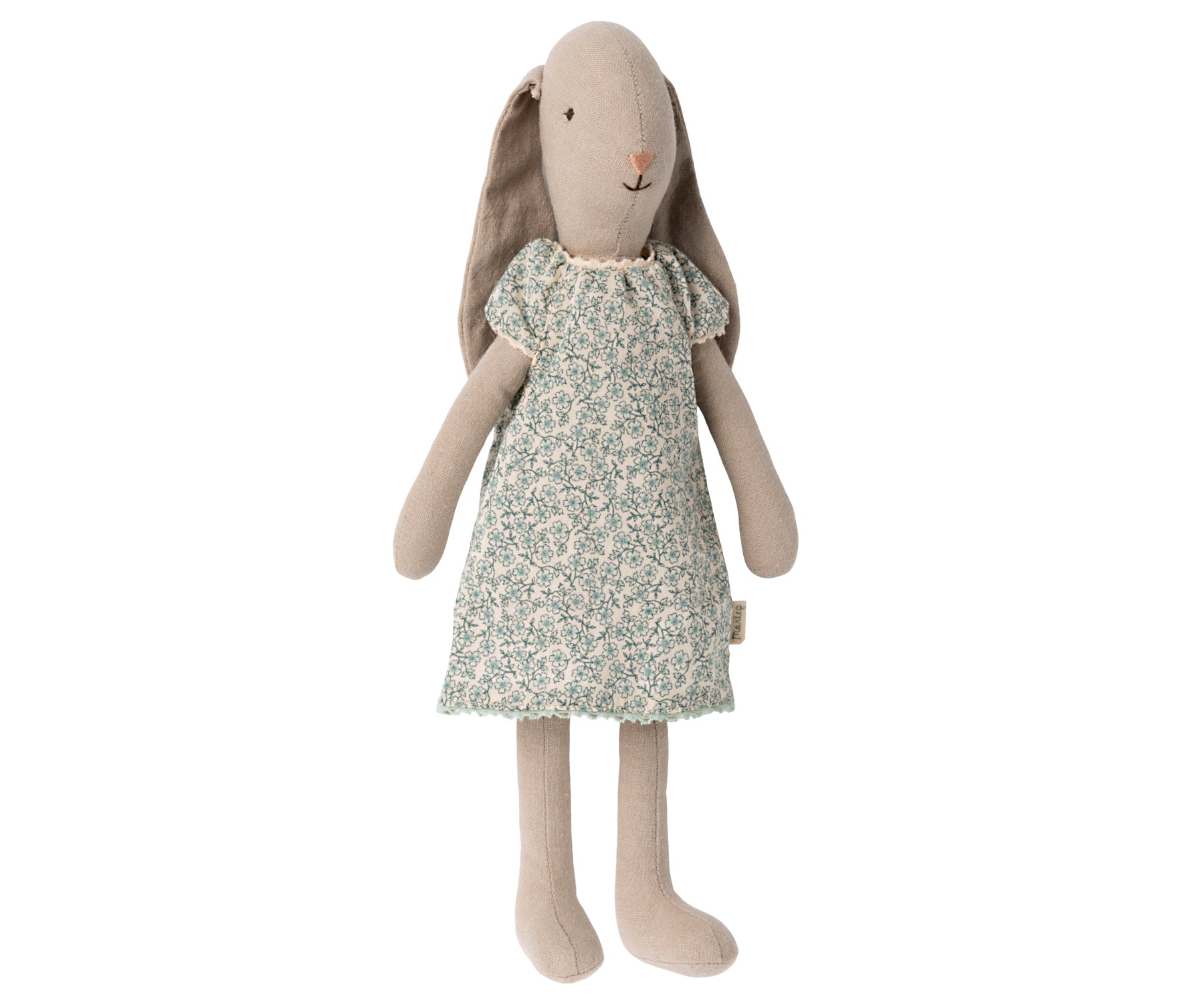 La colección de conejitos y conejos está confeccionada con un suave tejido natural de lino y algodón, lo que le da un tacto y un aspecto agradable a la mano. Este conejito usa un suave camisón.