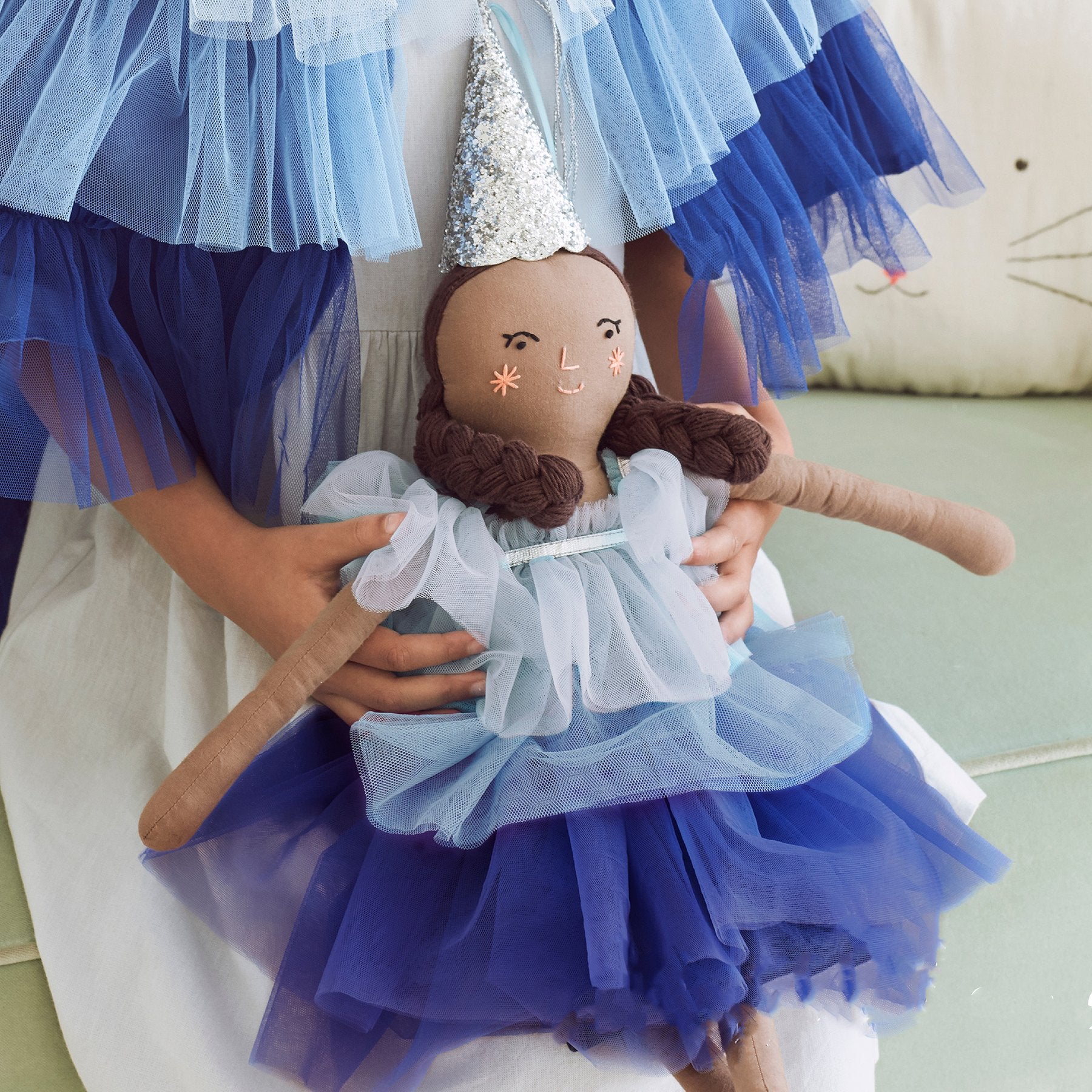 Esme es una muñeca muy estilosa perfecta para un juego imaginativo... y achuchones. Tiene un precioso pelo trenzado, un vestido en azules degradados con volantes de gasa, un sombrero en glitter plateado con cintas (que se puede quitar y poner para que lo usen los niños también gracias a su clip!)