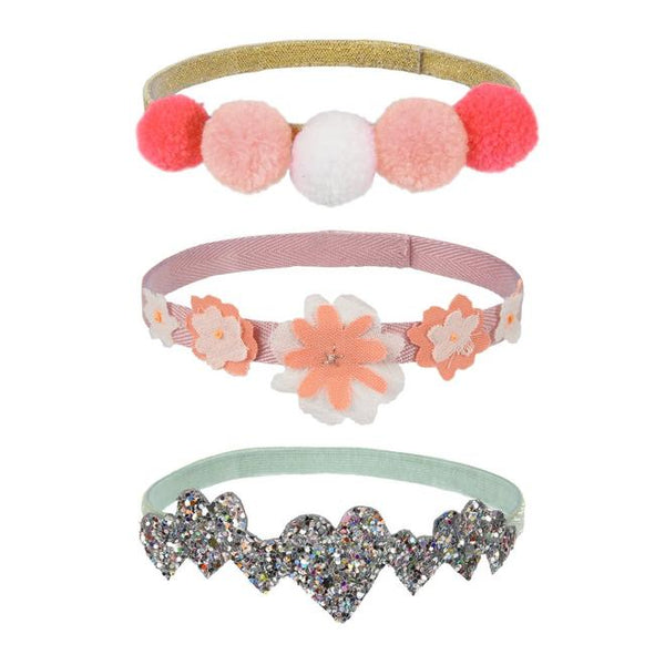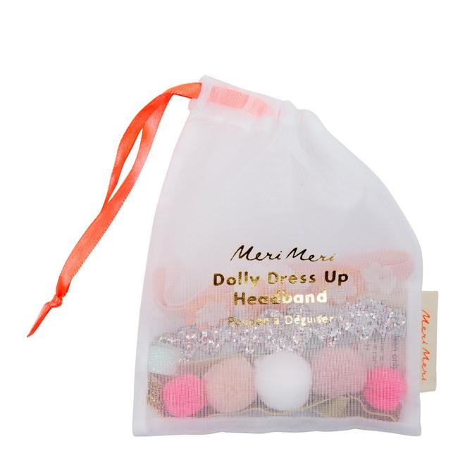 Añade estos elementos al baúl de disfraces de tu muñeca: tres diademas hechas con compones, glitter, flores, cinta elástica dorada.... presentados en una bonita bolsa de organza.