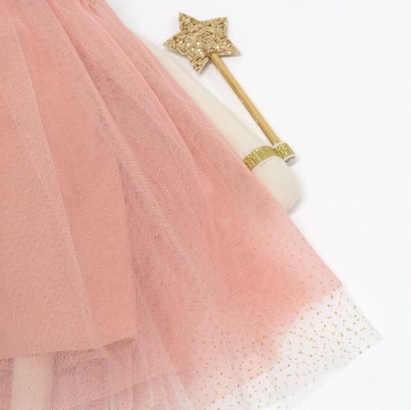 - Vestida con un vaporoso vestido de tul rosa