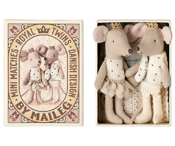 La familia de los ratones reales se hace más grande con estos gemelos. Llevan coronas de oro y ropa hermosa. Duermen en una bonita caja de cerillas decorada y encaja perfectamente en el castillo de Maileg.