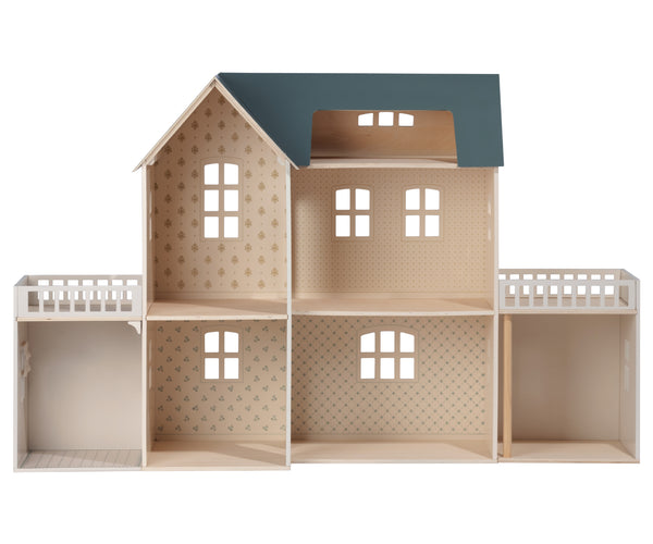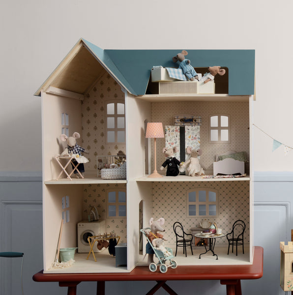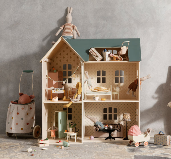 La casita de muñecas de madera Maileg, modelo de 2023. . Perfecta para ratones, conejitos y todos tus amigos Maileg. Personalízala como quieras con el mobiliario Maileg, aquí hemos hecho una selección de los muebles que creemos que encajan mejor con el tamaño de las estancias de la casa.