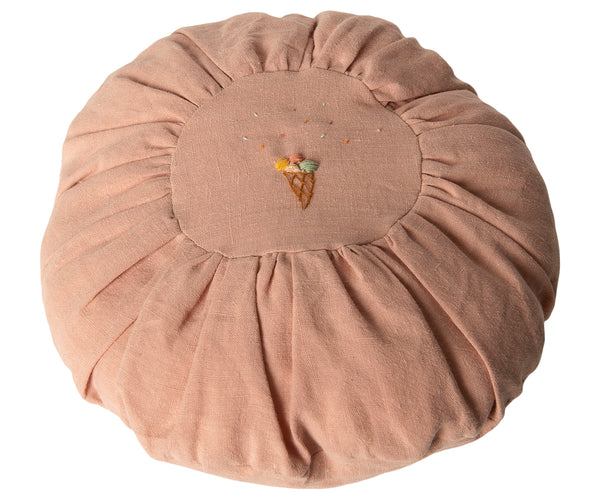 Cojín con funda hecha en lino natural con un suave color rosa maquillaje y y un detalle bordado