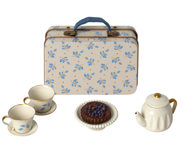 Maleta con lo necesario para una buena merienda con tus ratoncitos Maileg, incluye maleta, 2 tazas, 2 platos, tetera y fuente con pastel