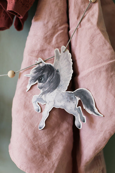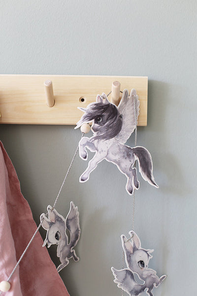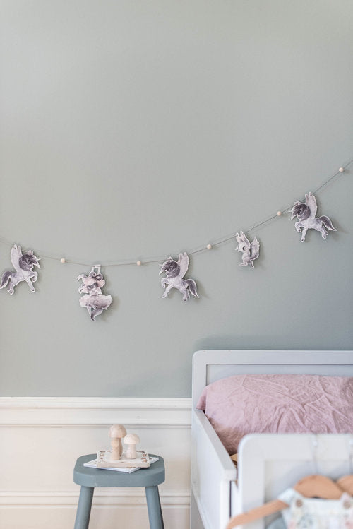 Cuelga tu guirnalda contra la pared, en una ventana, del techo... incluye 1 colgante Miss Frankie, 4 conejitos y 4 unicornios.