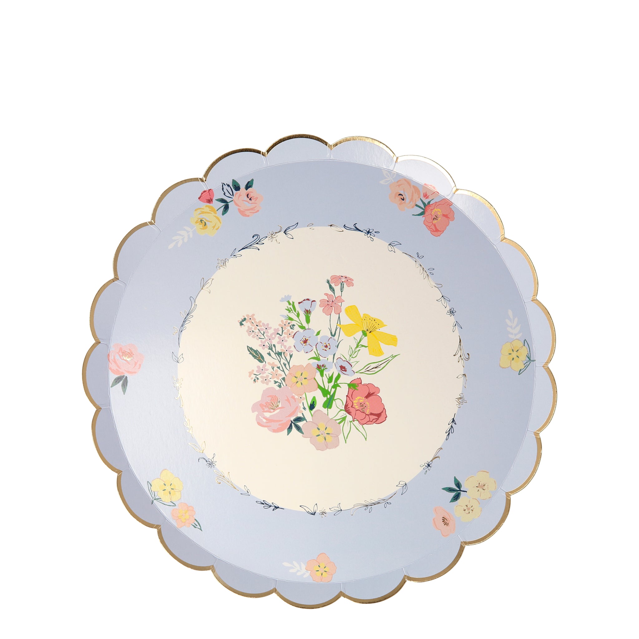 Añade encanto floral a tu mesa con estos bonitos platos con delicadas florecitas silvestres, el filo dorado en ondas añade un toque sofisticado.