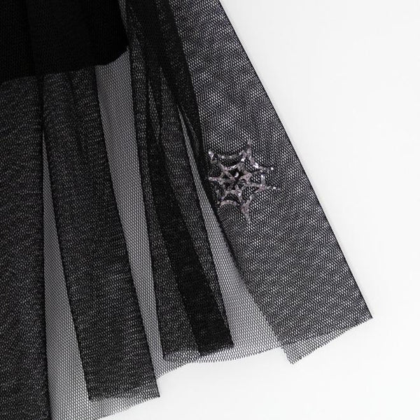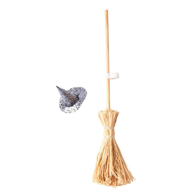 Luna lleva un vestido negro y capa de tul llena de telarañas brillantes. Tiene un gorrito negro con glitter (que tienen un clip para que tu pequeña lo pueda llevar como adorno de pelo) y una escoba, elemento imprescindible de toda bruja que se precie.