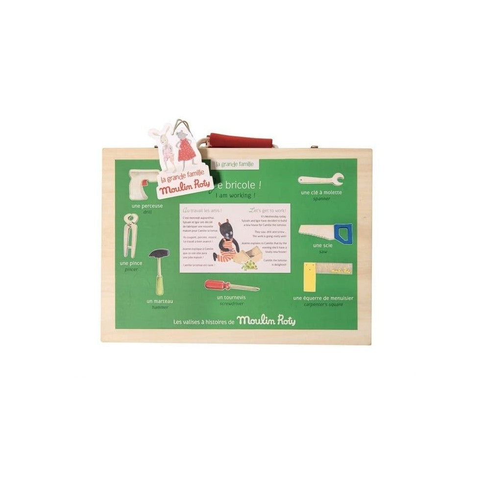 Verdaderas herramientas de madera guardadas en un precioso maletín también de madera ilustrado con varios personajes de la gran familia como Sylvain el conejo y Jeanne la oca.