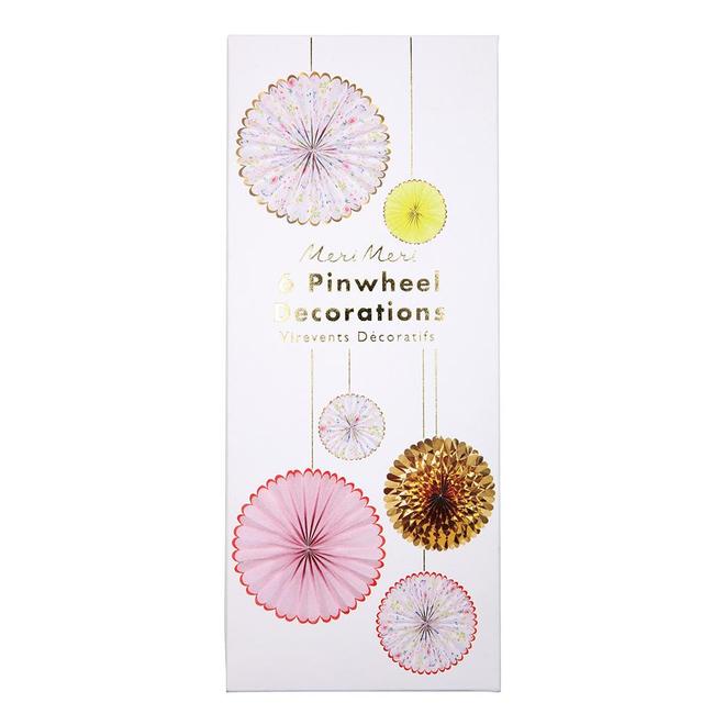 Pack 6 molinillos con motivos de flores tipo liberty, dorado metalizado y neón. Platos y vasos de la misma serie.