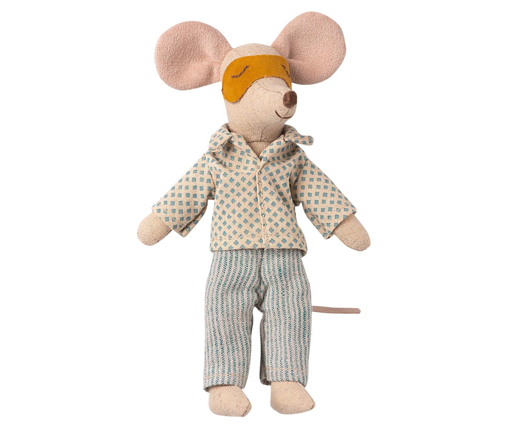 Nuestros ratoncitos se ponen guapos hasta para irse a la cama. Pijama y antifaz a juego.