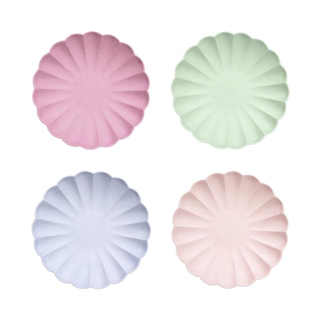 El pack contiene 8 platos en 4 colores diferentes. Están hechos en papel ecológico y teñidos con tintes con base al agua.
