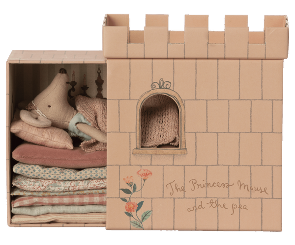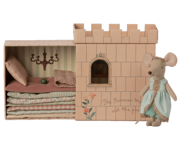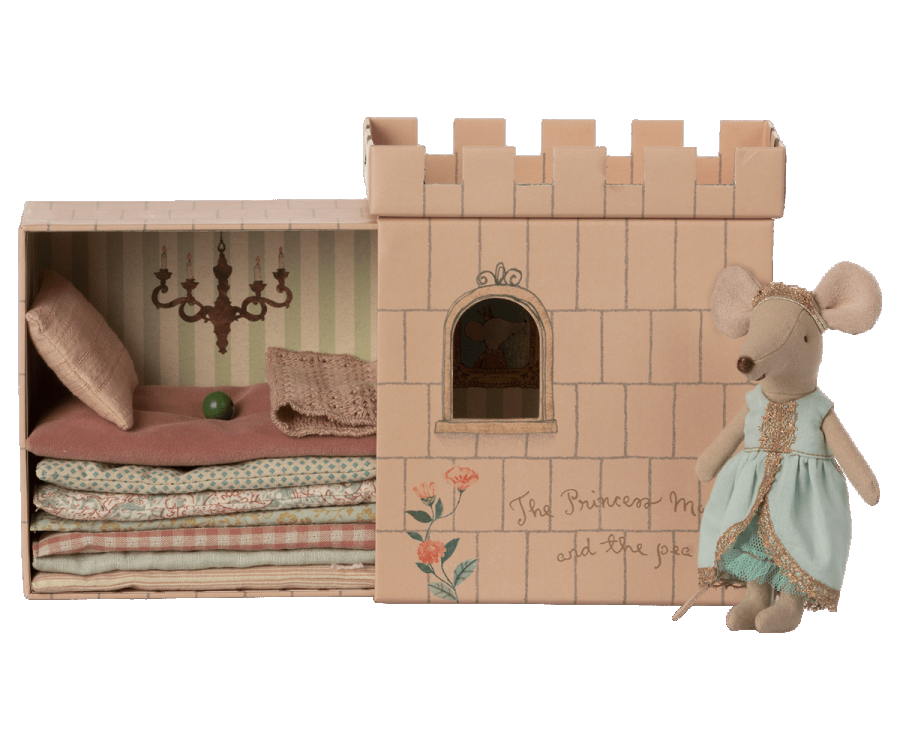Te encantará esta nueva versión de Maileg de La Princesa y el Guisante. Esta princesa, que lleva un precioso vestido brillante azul y corona, viene en una caja-castillo ilustrada que se configura de distintas maneras para jugar: cerrada para guardarlo todo, abierta como cama, con ambas partes montadas como torre del castillo... deja que los pequeños decidan cómo.