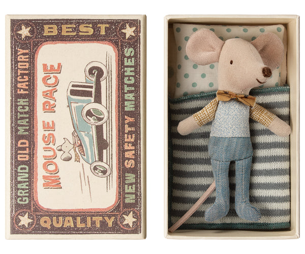Este ratoncito llama la atención con su elegante ropa y su pajarita. Incluye una cama-caja de cerillas con su almohada y su colcha.