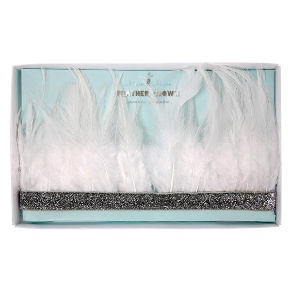 Tocado de plumas blancas con cinta elástica en glitter plata.